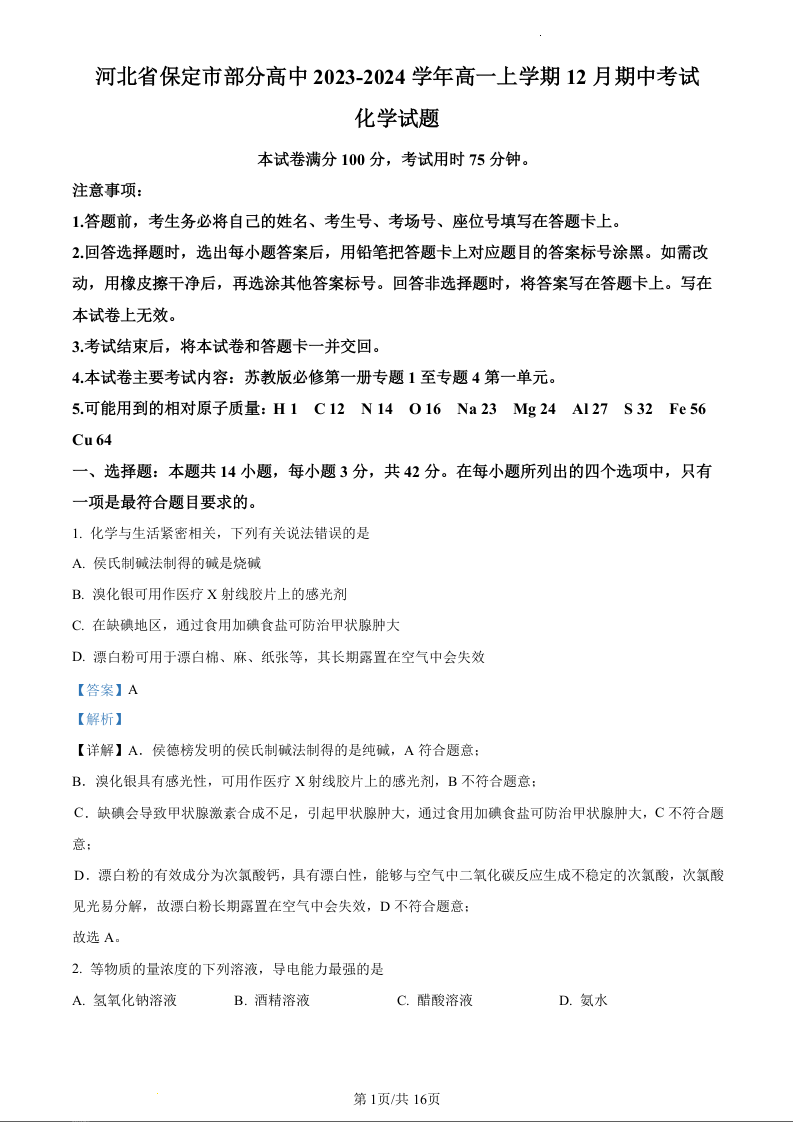 河北省保定市部分高中2023-2024学年高一上学期12月期中考试化学(精品解析版)