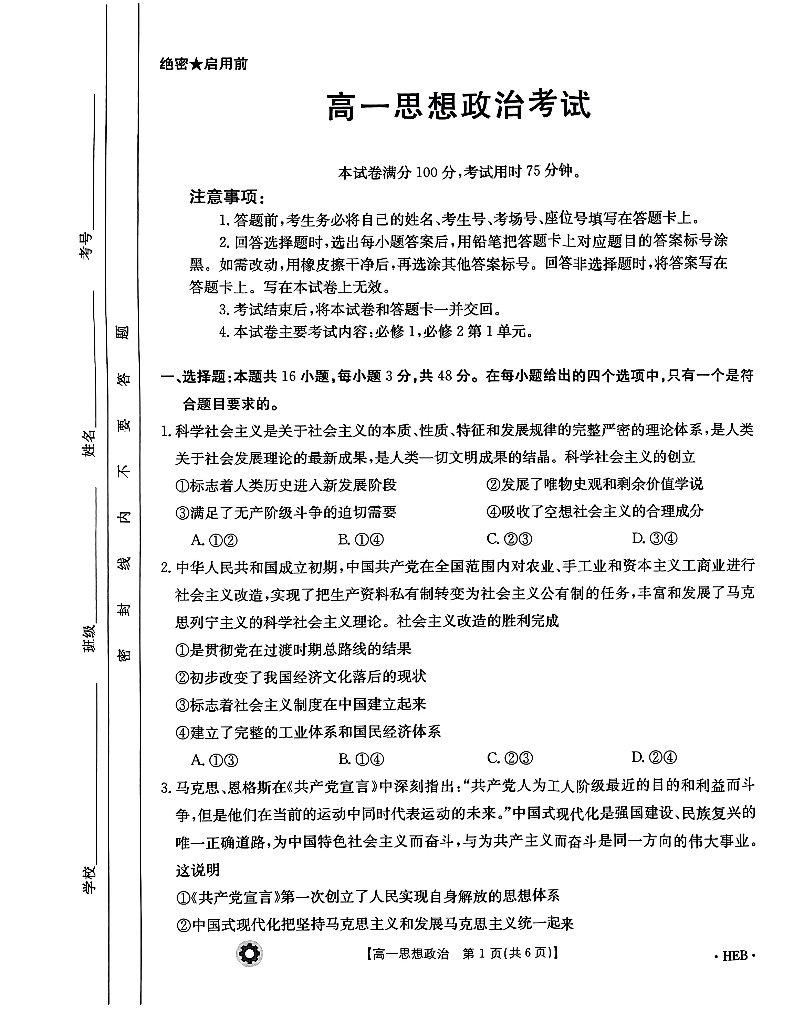 河北省保定市部分高中2023-2024学年高一上学期12月期中考试政治