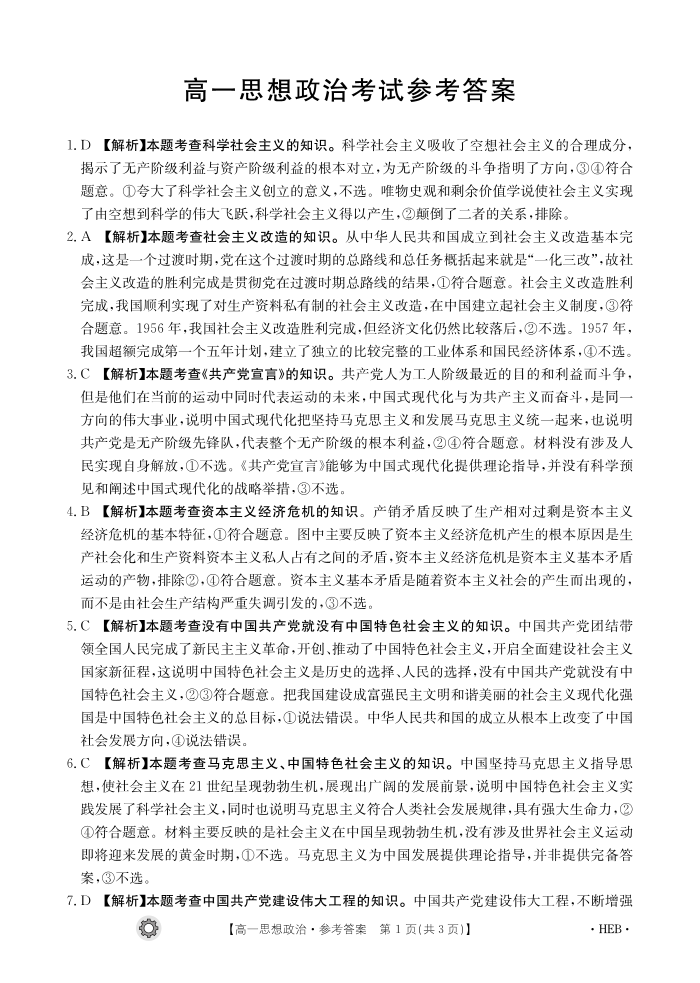 河北省保定市部分高中2023-2024学年高一上学期12月期中考试政治答案