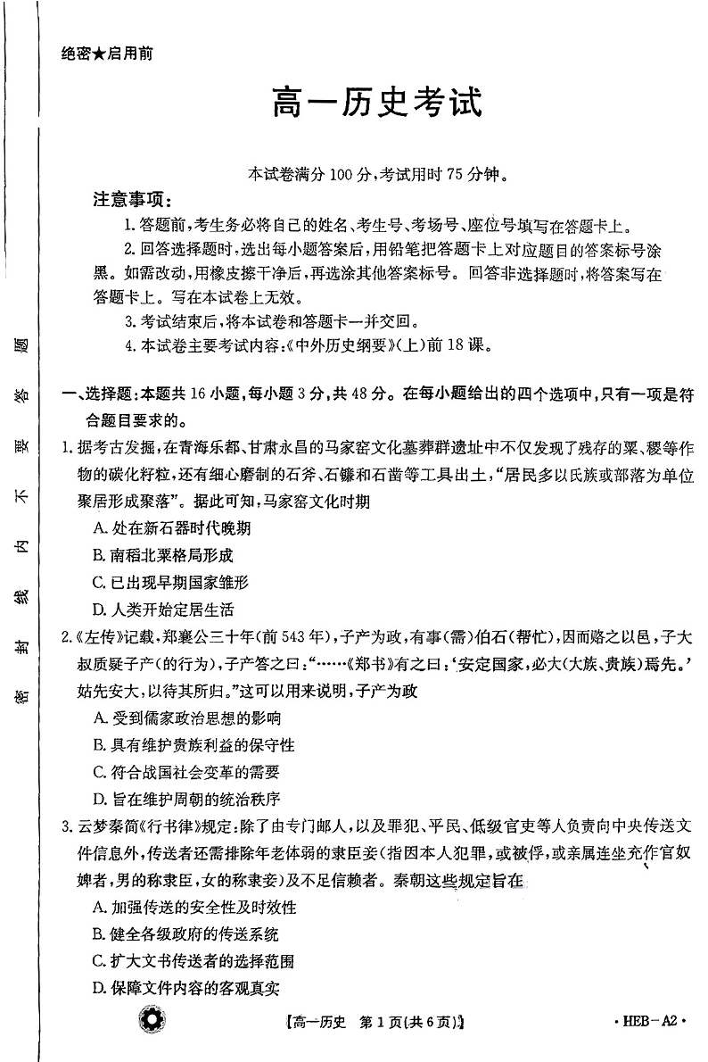 河北省保定市部分高中2023-2024学年高一上学期12月期中考试历史