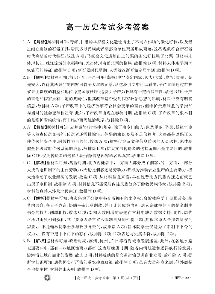 河北省保定市部分高中2023-2024学年高一上学期12月期中考试历史答案