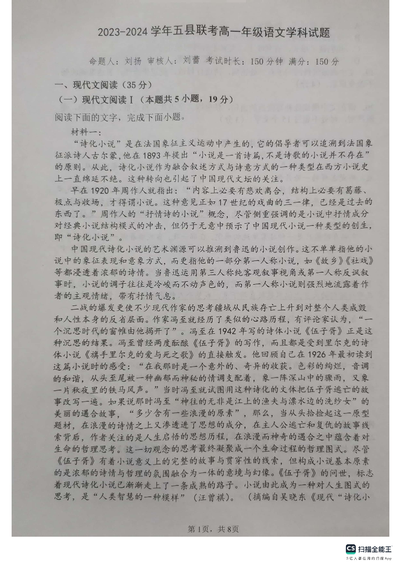 河南省开封市五县联考2023-2024学年高一上学期12月期中考试语文
