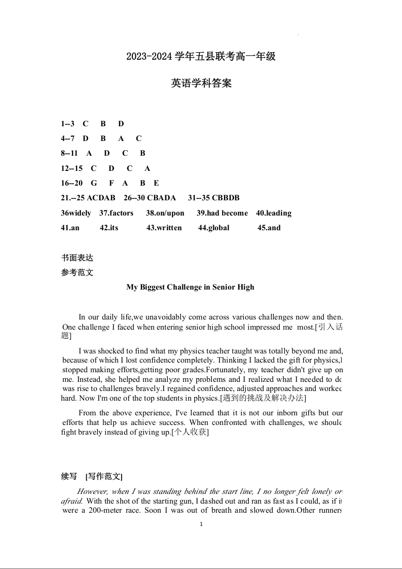 河南省开封市五县联考2023-2024学年高一上学期12月期中考试英语答案