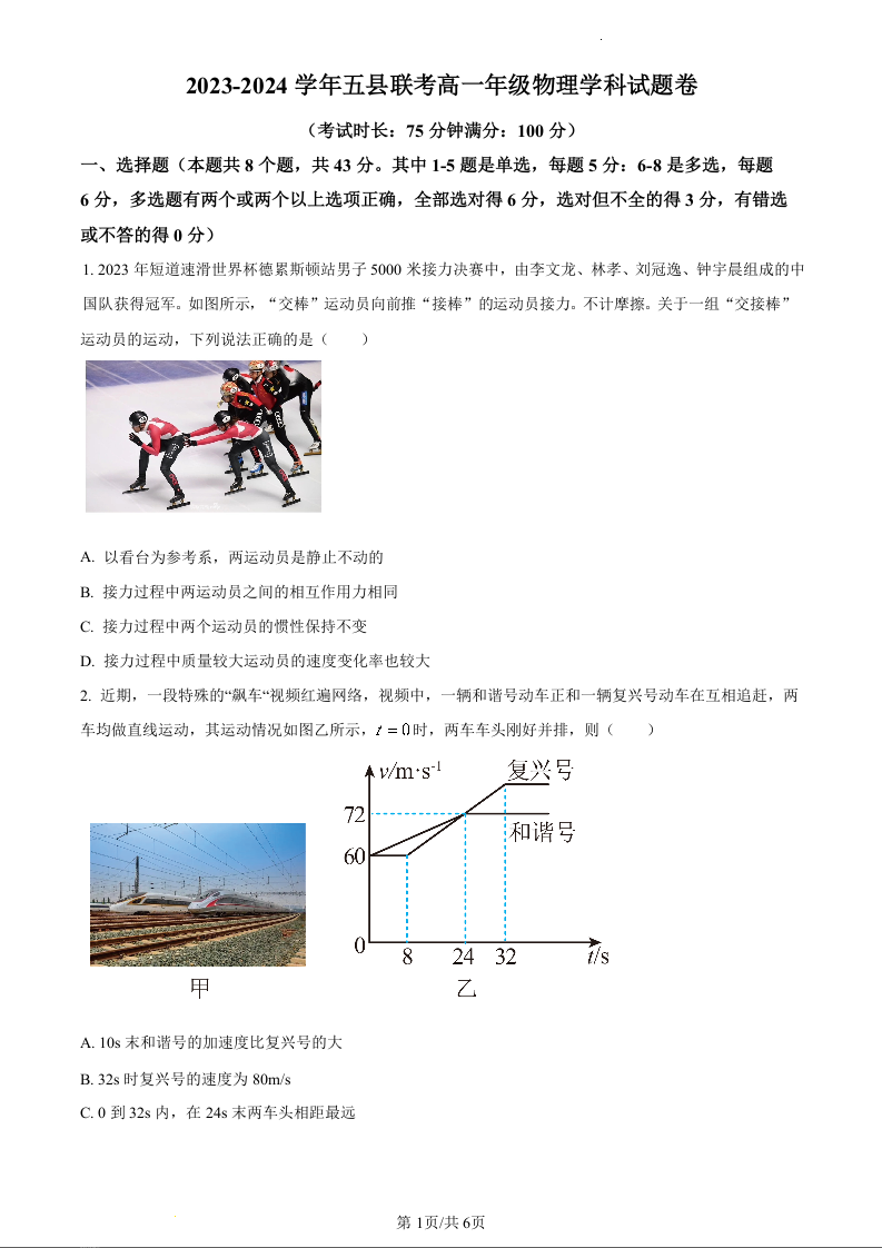 河南省开封市五县联考2023-2024学年高一上学期12月期中考试物理(原卷版)