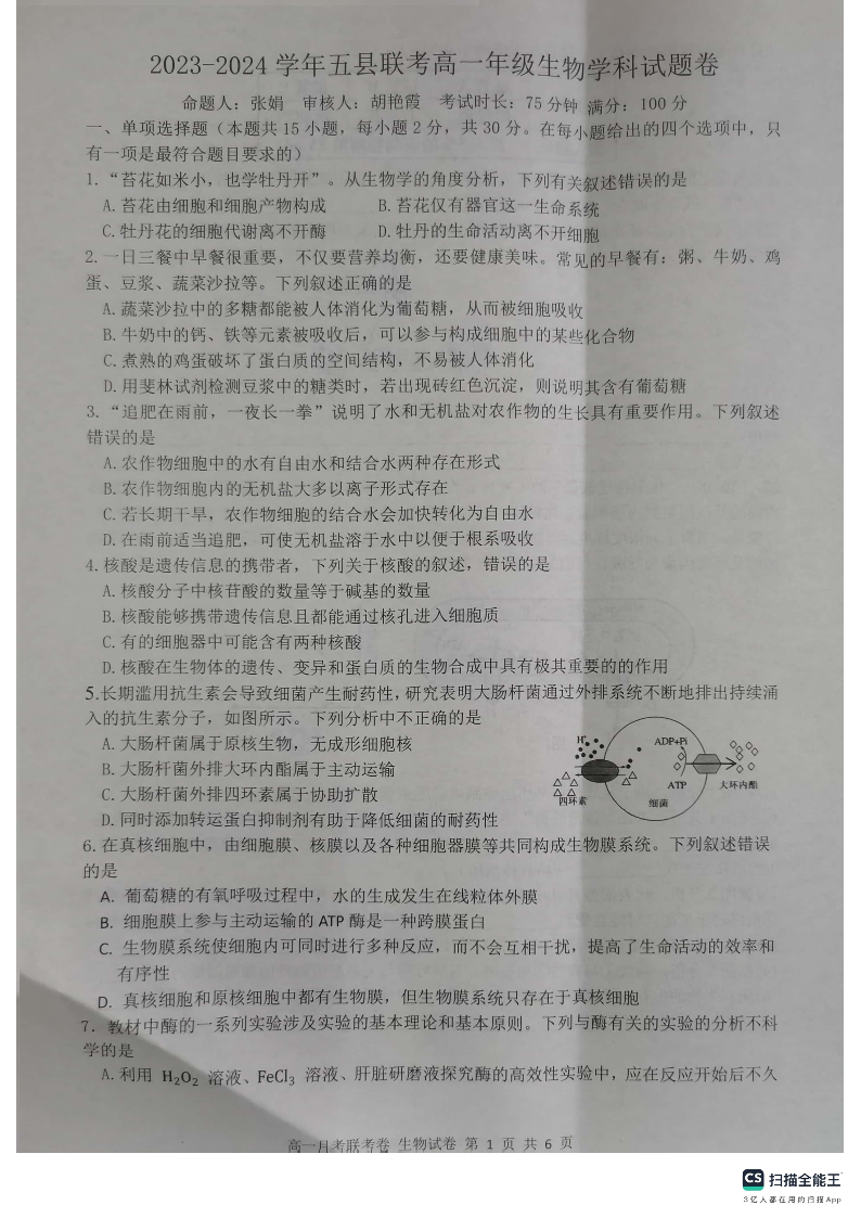 河南省开封市五县联考2023-2024学年高一上学期12月期中考试生物
