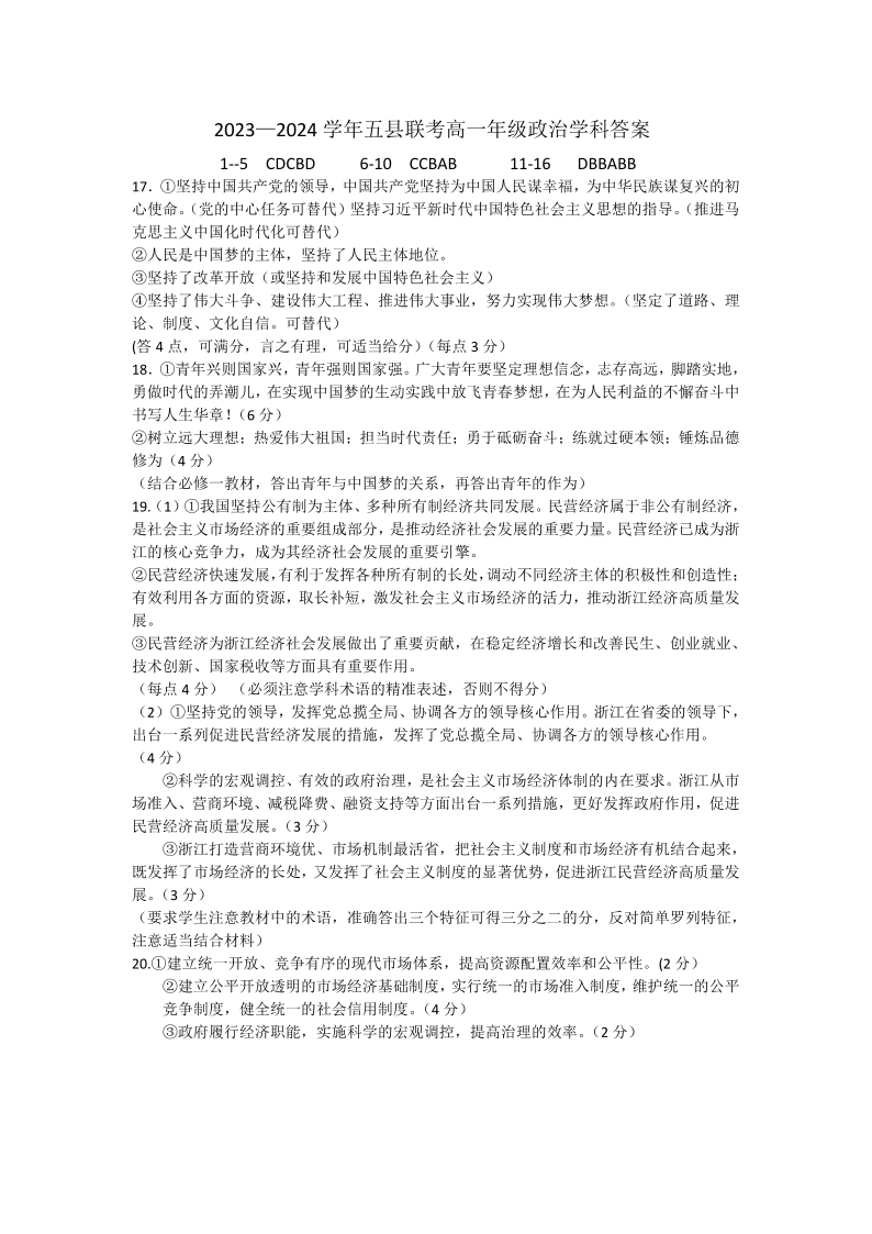河南省开封市五县联考2023-2024学年高一上学期12月期中考试政治答案