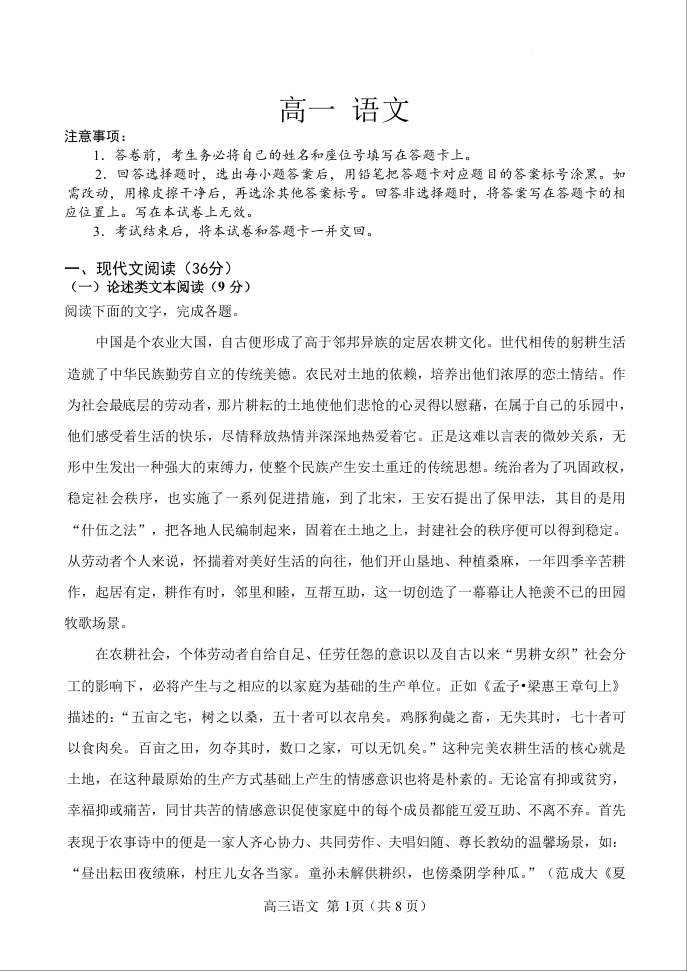 河南省南阳市第一中学校2023-2024学年高一上学期12月月考语文+答案