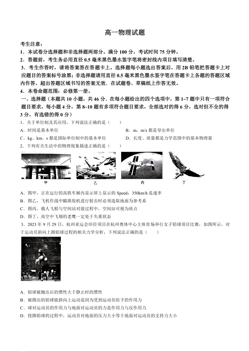 河南省新乡市九师联盟2023-2024学年高一上学期12月月考物理