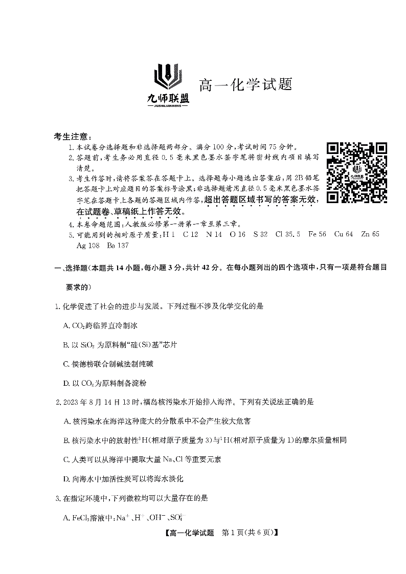 河南省新乡市九师联盟2023-2024学年高一上学期12月月考化学