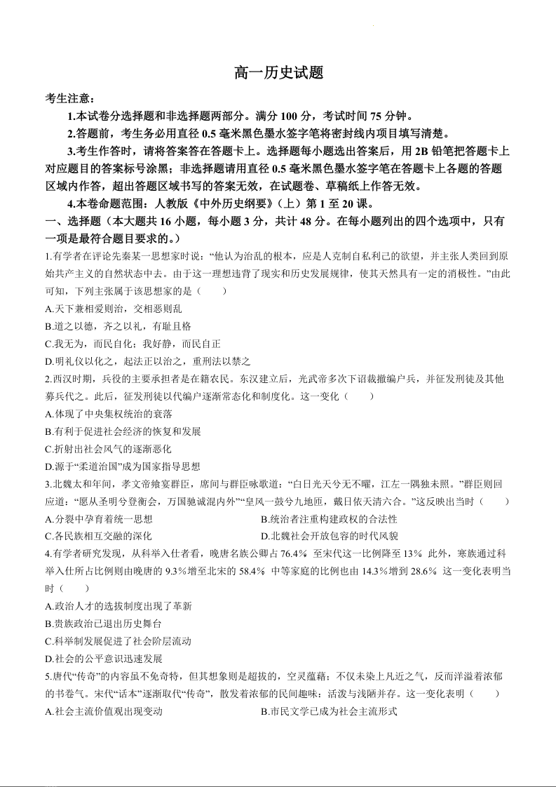 河南省新乡市九师联盟2023-2024学年高一上学期12月月考历史