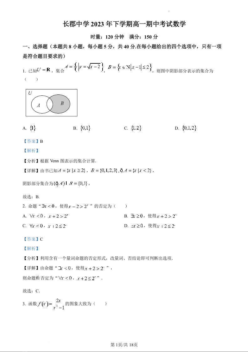 湖南省长沙市长郡中学2023-2024学年高一上学期期中考试数学(精品解析版)