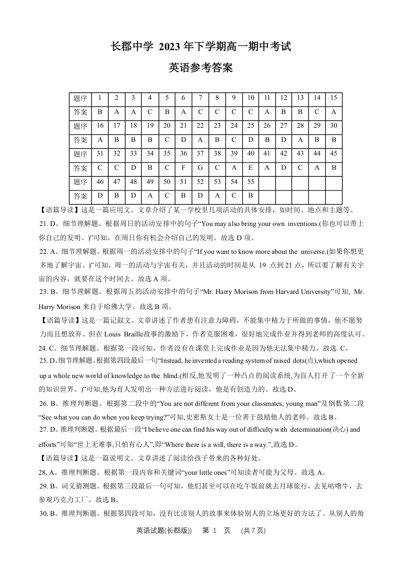 湖南省长沙市长郡中学2023-2024学年高一上学期期中考试英语答案