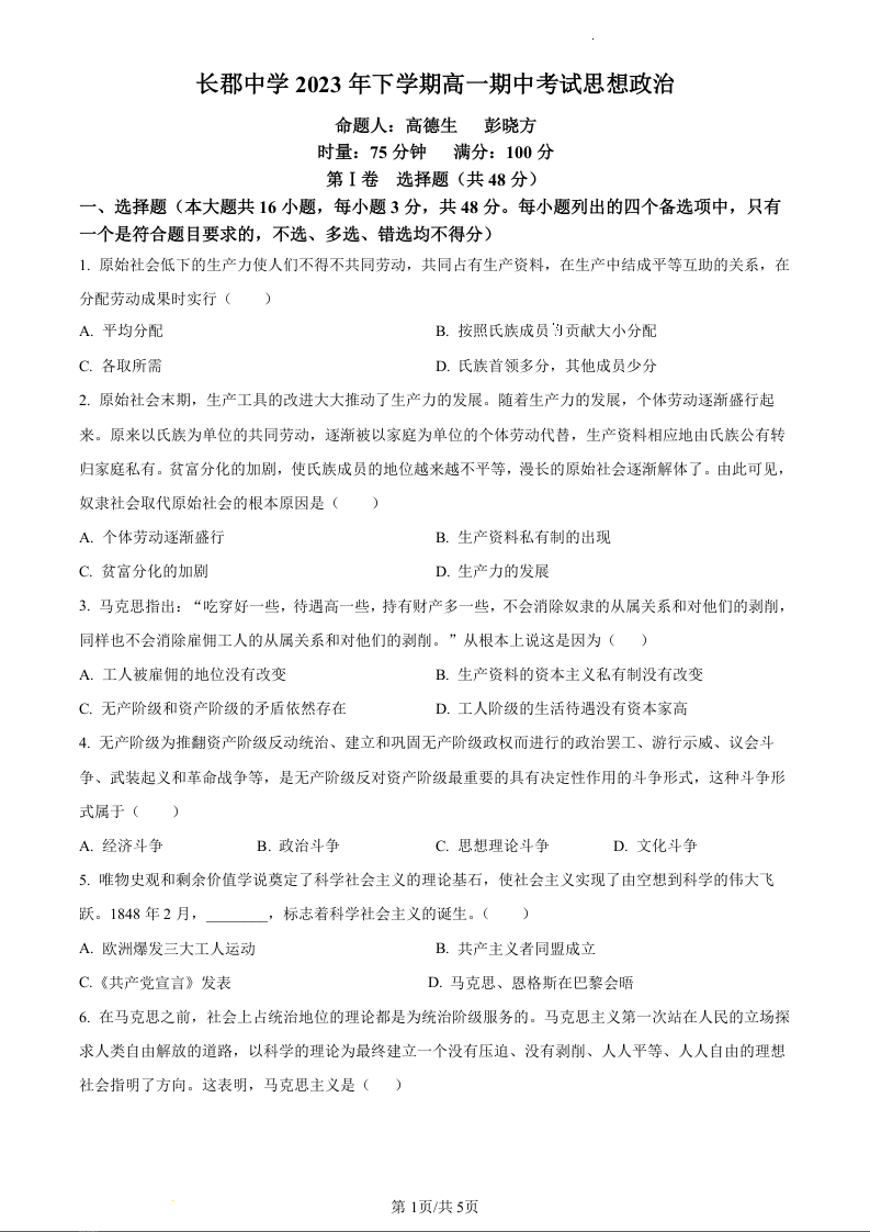 湖南省长沙市长郡中学2023-2024学年高一上学期期中考试政治(原卷版)