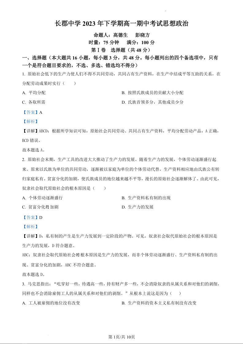 湖南省长沙市长郡中学2023-2024学年高一上学期期中考试政治(精品解析版)