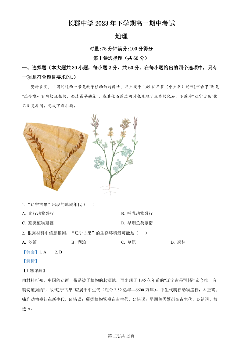 湖南省长沙市长郡中学2023-2024学年高一上学期期中考试地理(精品解析版)