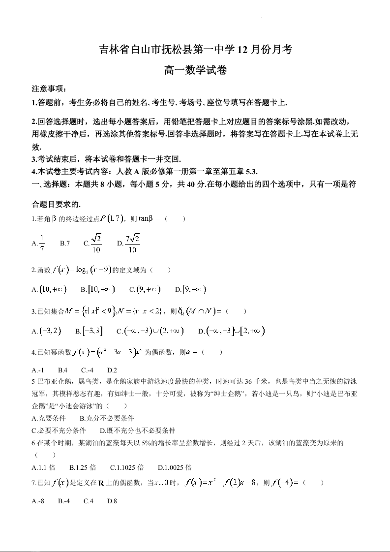 吉林省2023-2024学年高一上学期12月月考数学+答案