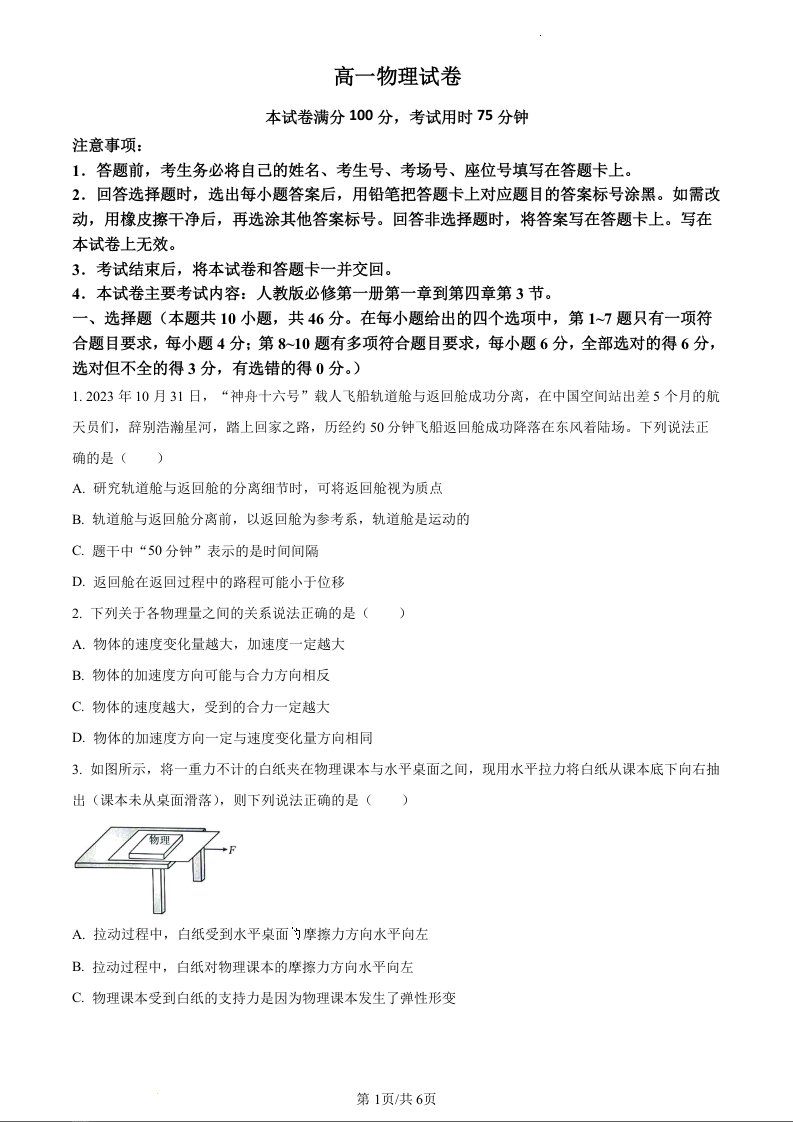 吉林省2023-2024学年高一上学期12月月考物理(原卷版)