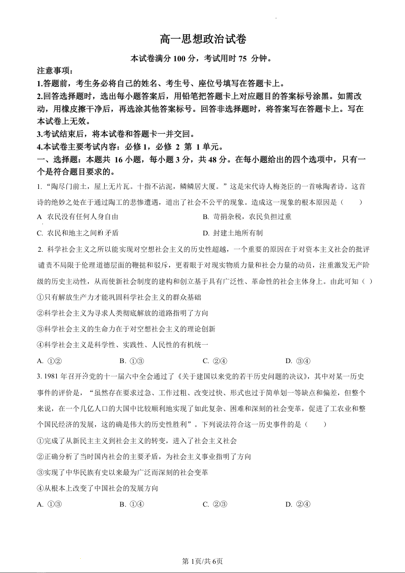 吉林省2023-2024学年高一上学期12月月考政治(原卷版)