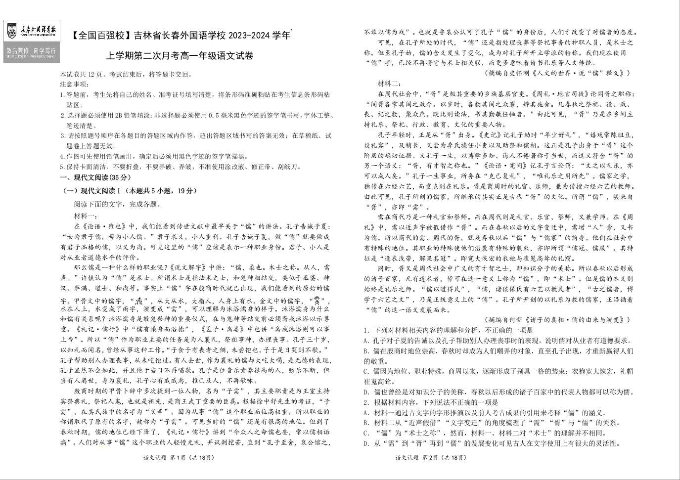 吉林省长春外国语学校2023-2024学年高一上学期12月月考语文+答案