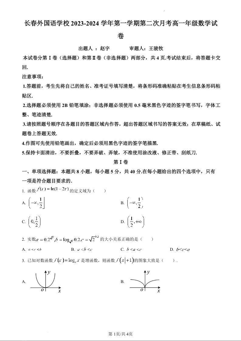吉林省长春外国语学校2023-2024学年高一上学期12月月考数学(原卷版)