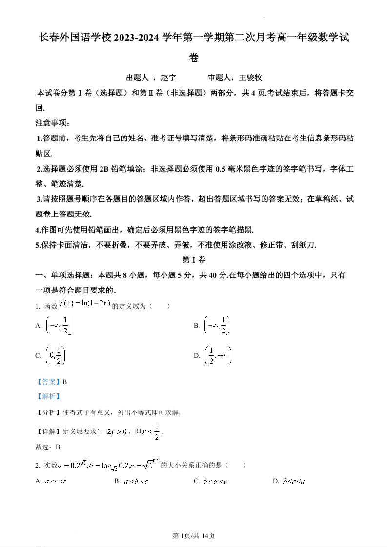 吉林省长春外国语学校2023-2024学年高一上学期12月月考数学(精品解析版)