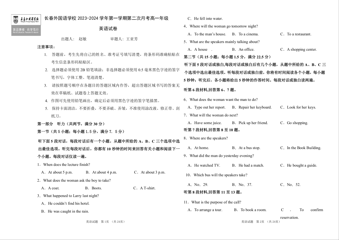 吉林省长春外国语学校2023-2024学年高一上学期12月月考英语+答案