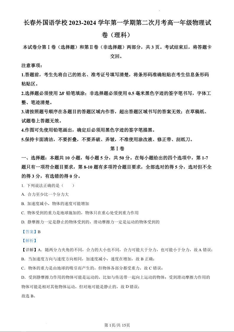 吉林省长春外国语学校2023-2024学年高一上学期12月月考物理(精品解析版)