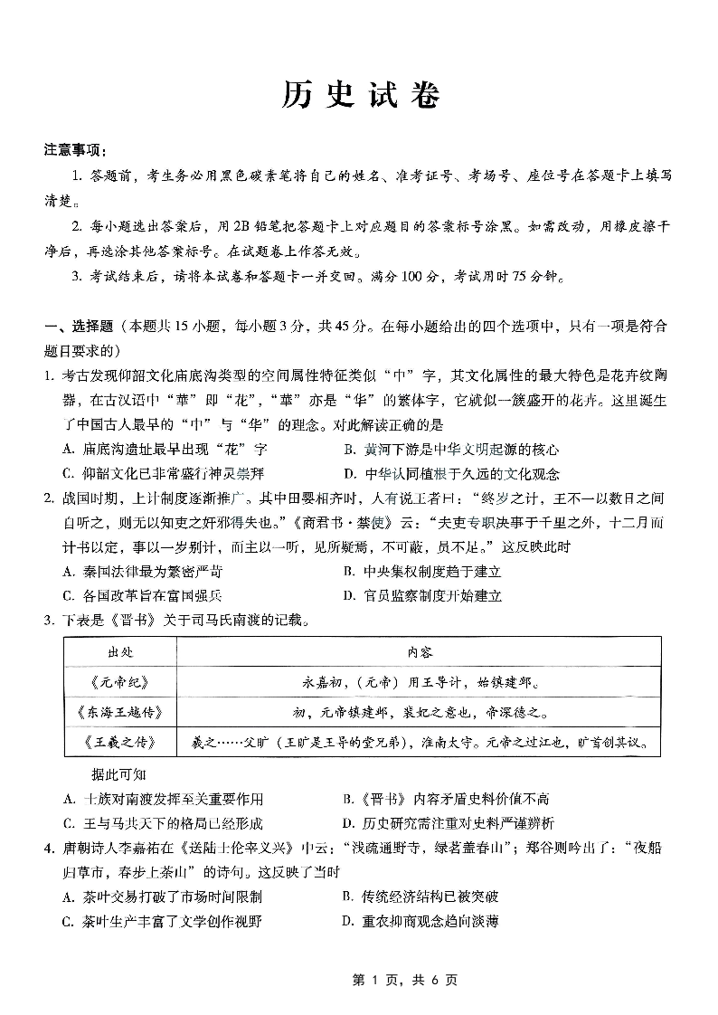 重庆市巴蜀中学2024-2025学年下学期高三适应性月考(六)历史