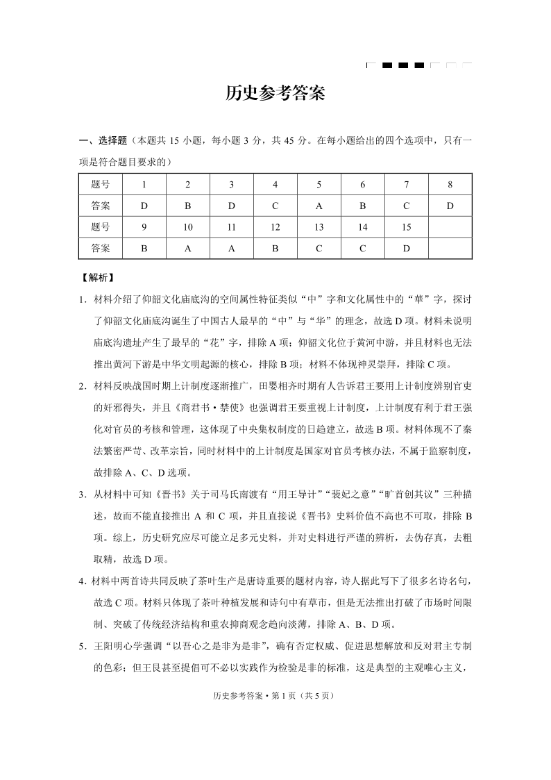 重庆市巴蜀中学2024-2025学年下学期高三适应性月考(六)历史答案