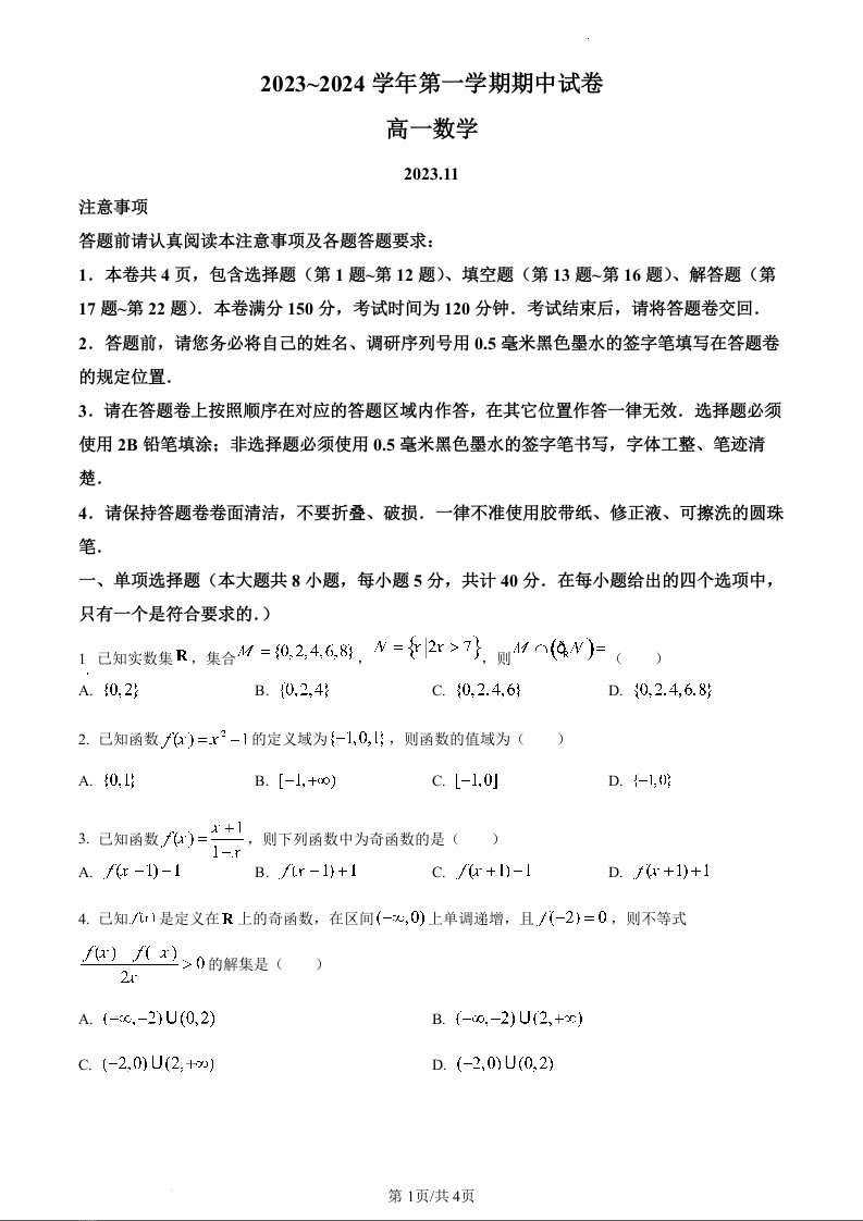 江苏省苏州市常熟市2023-2024学年高一上学期期中考试数学(原卷版)