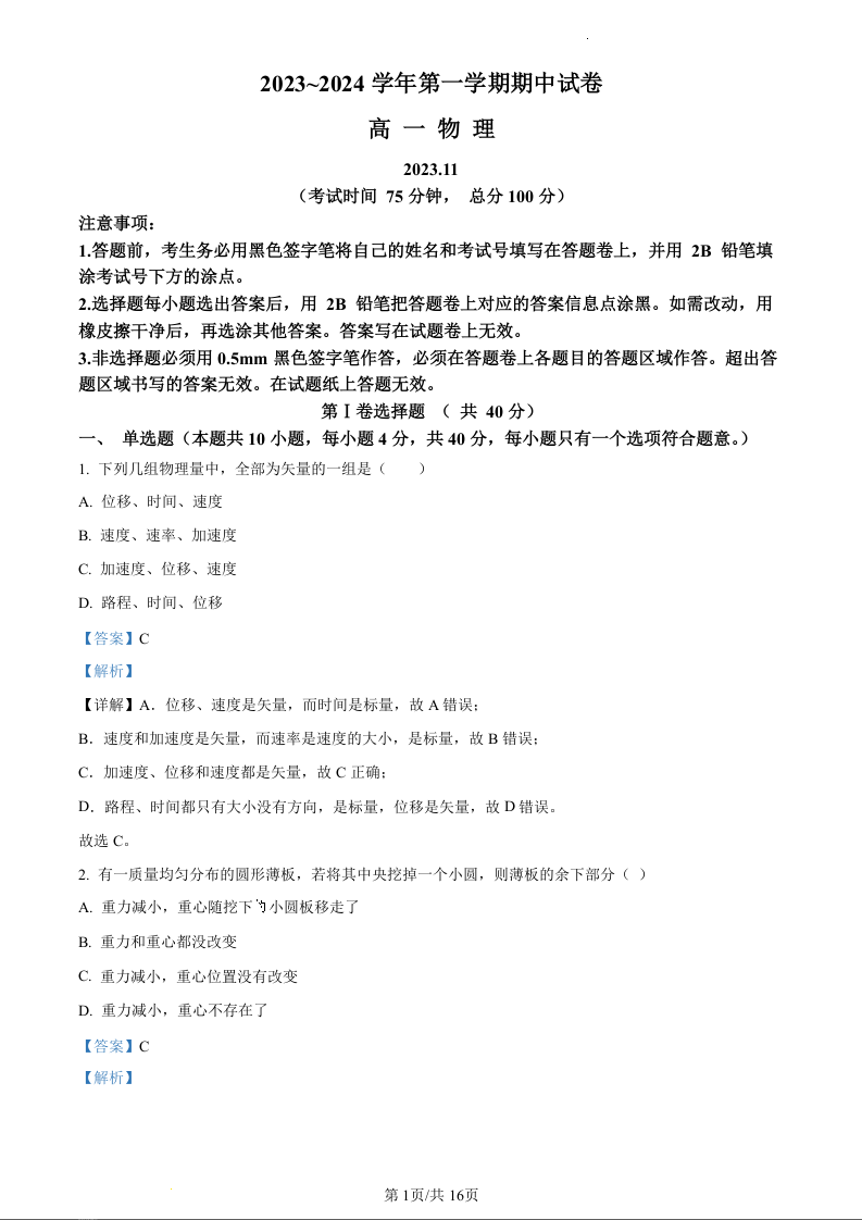 江苏省苏州市常熟市2023-2024学年高一上学期期中考试物理(精品解析版)