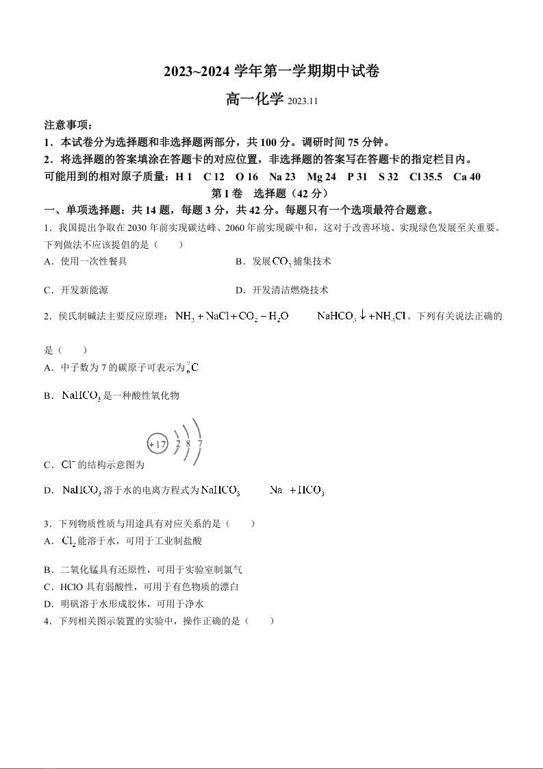 江苏省苏州市常熟市2023-2024学年高一上学期期中考试化学+答案