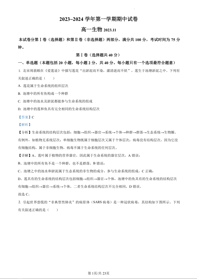 江苏省苏州市常熟市2023-2024学年高一上学期期中考试生物(精品解析版)