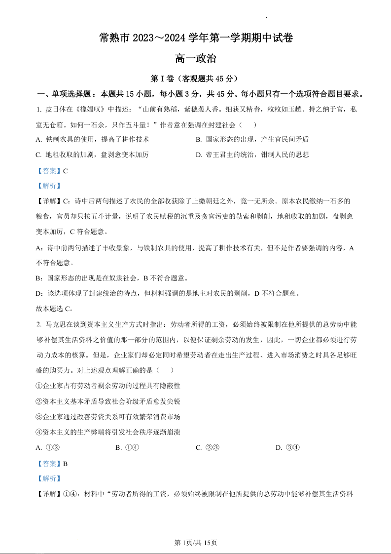 江苏省苏州市常熟市2023-2024学年高一上学期期中考试政治 (精品解析版)