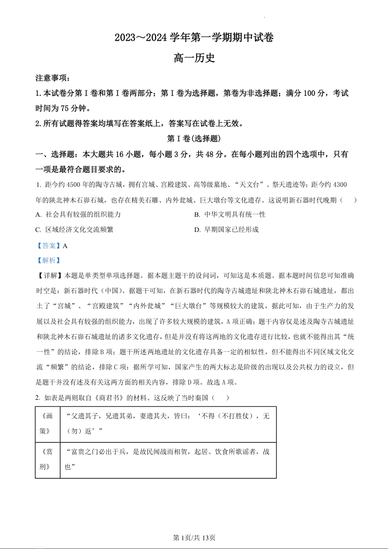 江苏省苏州市常熟市2023-2024学年高一上学期期中考试历史(精品解析版)