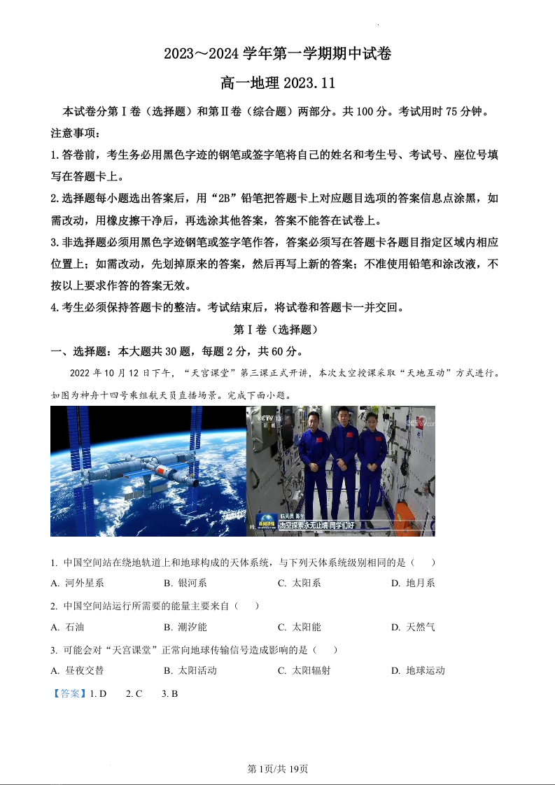 江苏省苏州市常熟市2023-2024学年高一上学期期中考试地理(精品解析版)