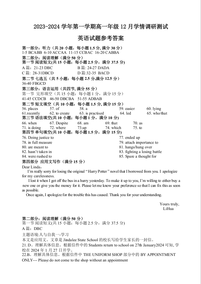 江苏省扬州市高邮市2023-2024学年高一上学期12月月考英语答案