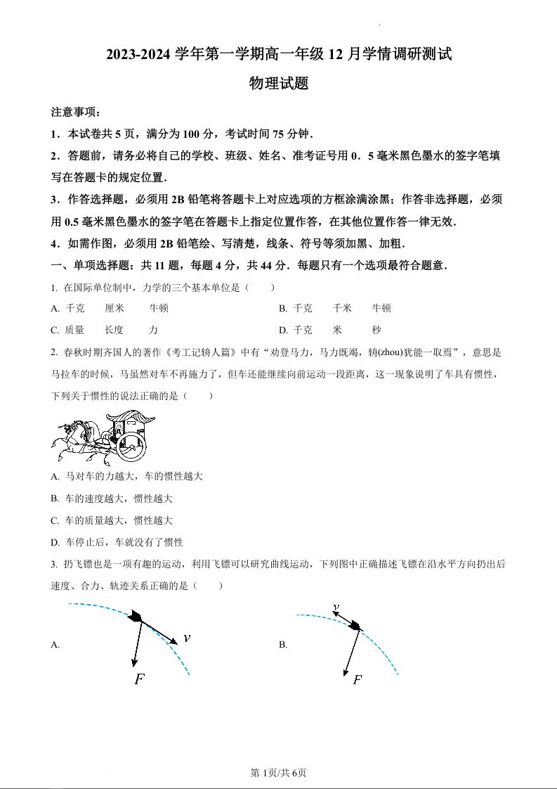 江苏省扬州市高邮市2023-2024学年高一上学期12月月考物理(原卷版)