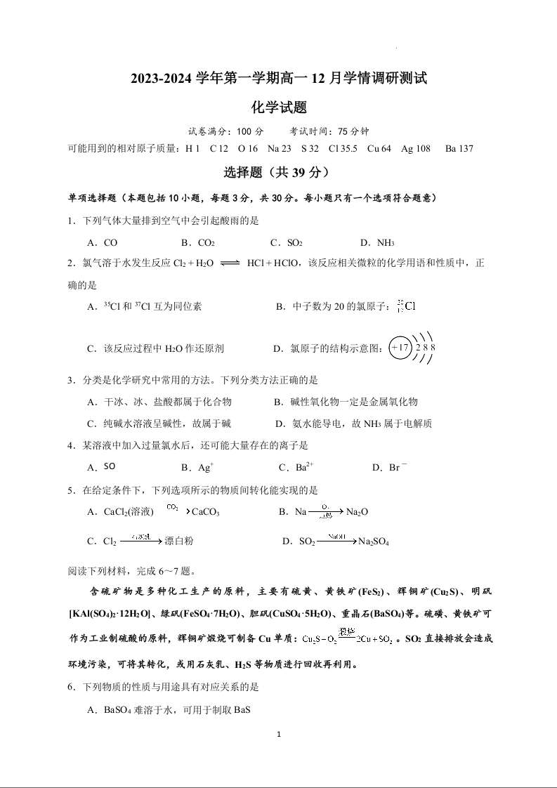 江苏省扬州市高邮市2023-2024学年高一上学期12月月考化学+答案