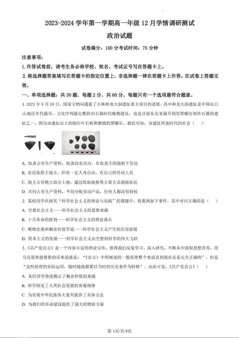江苏省扬州市高邮市2023-2024学年高一上学期12月月考政治(原卷版)