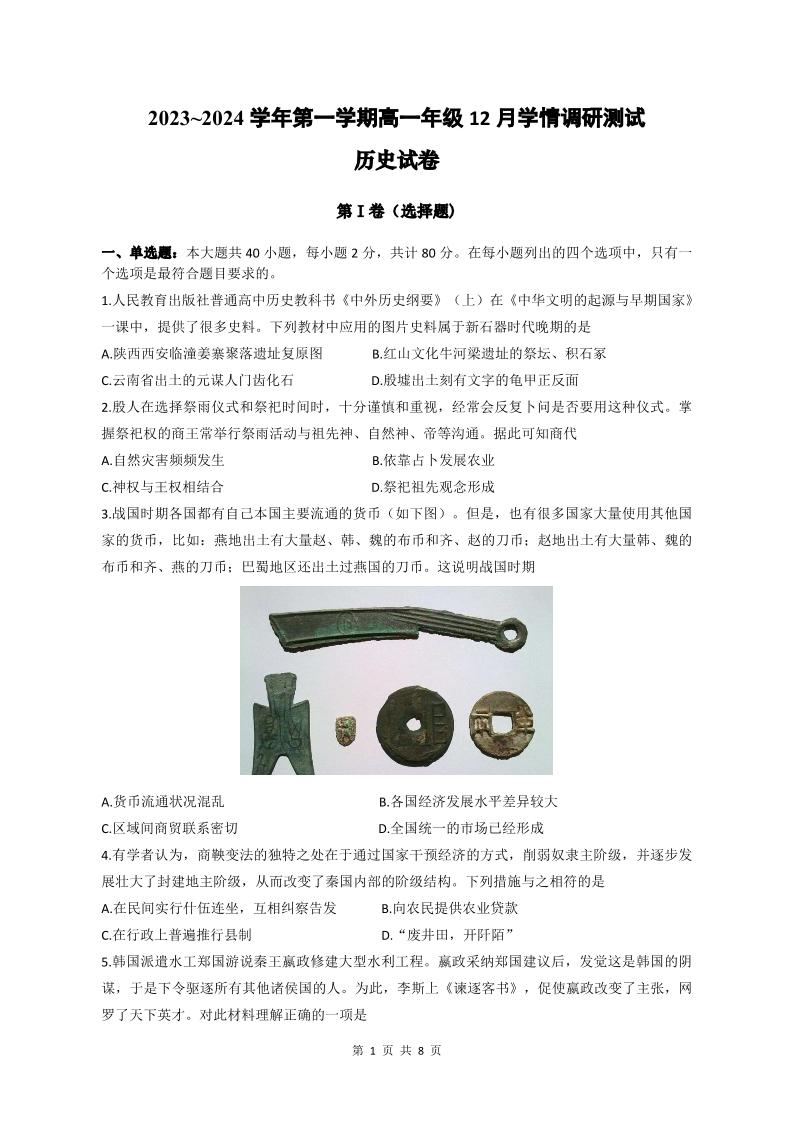 江苏省扬州市高邮市2023-2024学年高一上学期12月月考历史