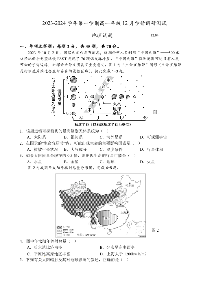 江苏省扬州市高邮市2023-2024学年高一上学期12月月考地理+答案
