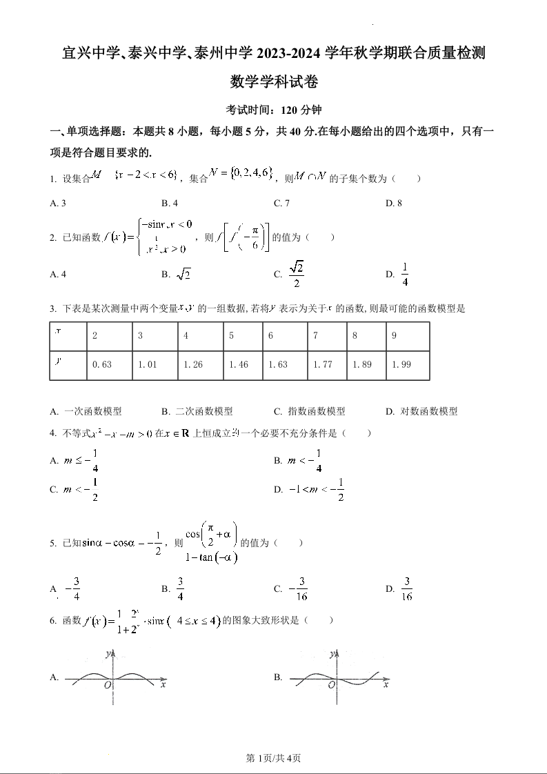 江苏省宜兴中学、泰兴中学、泰州中学2023-2024学年高一上学期12月联合质量检测数学(原卷版)