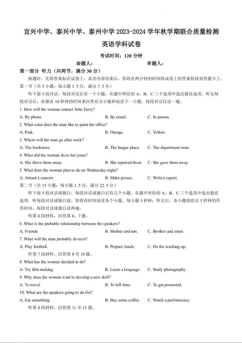 江苏省宜兴中学、泰兴中学、泰州中学2023-2024学年高一上学期12月联合质量检测英语+答案