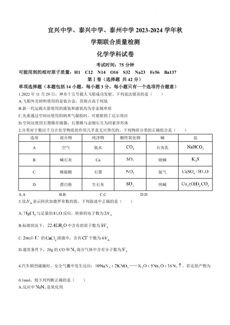 江苏省宜兴中学、泰兴中学、泰州中学2023-2024学年高一上学期12月联合质量检测化学+答案