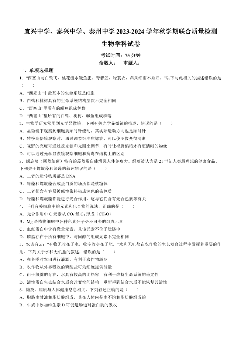 江苏省宜兴中学、泰兴中学、泰州中学2023-2024学年高一上学期12月联合质量检测生物