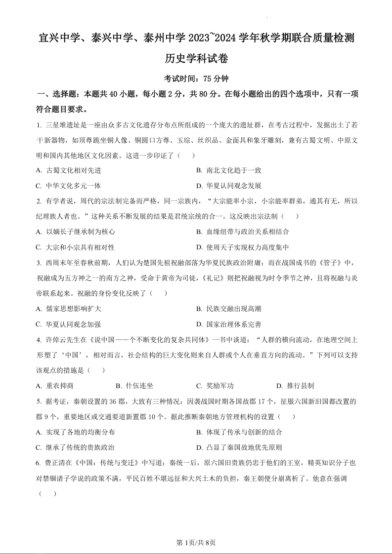 江苏省宜兴中学、泰兴中学、泰州中学2023-2024学年高一上学期12月联合质量检测历史(原卷版)
