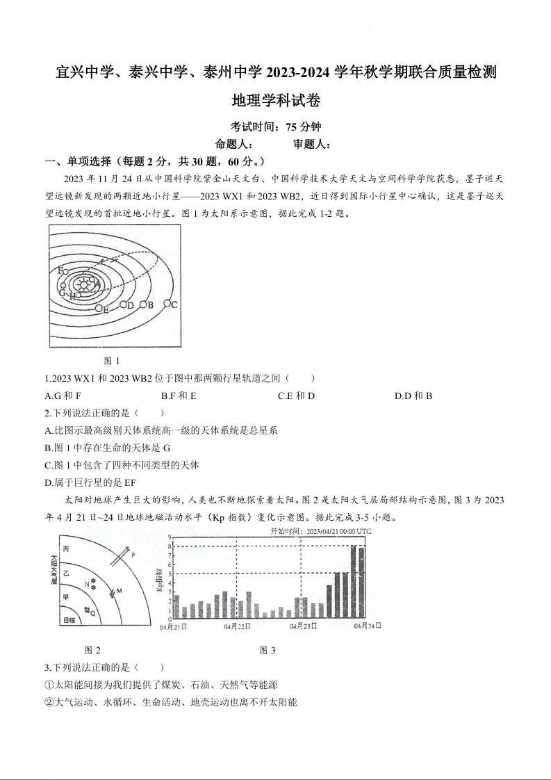江苏省宜兴中学、泰兴中学、泰州中学2023-2024学年高一上学期12月联合质量检测地理+答案