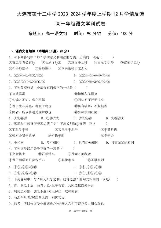 辽宁省大连市第十二中学2023-2024学年高一上学期12月学情反馈语文