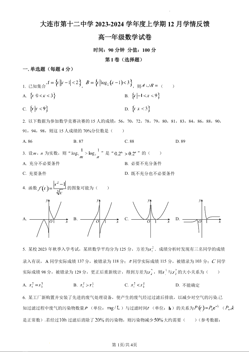 辽宁省大连市第十二中学2023-2024学年高一上学期12月学情反馈数学(原卷版)